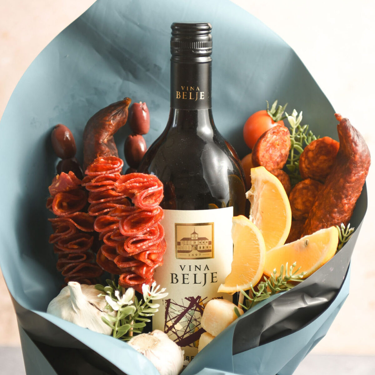 Dan očeva ili bilo koja prigoda će biti još posebnija uz ovakav buket s bocom Vina Belje i tradicionalnim suhomesnatim proizvodima Belje.